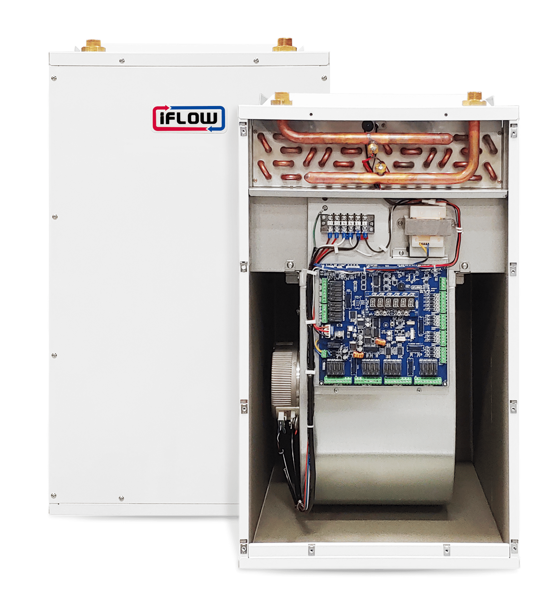 An iFLOW HYDRONIC FURNACE (aka Air Handler or AHU) is an indoor component of an HVAC system that efficiently transfers and moves heated or cooled air throughout the ductwork of your home